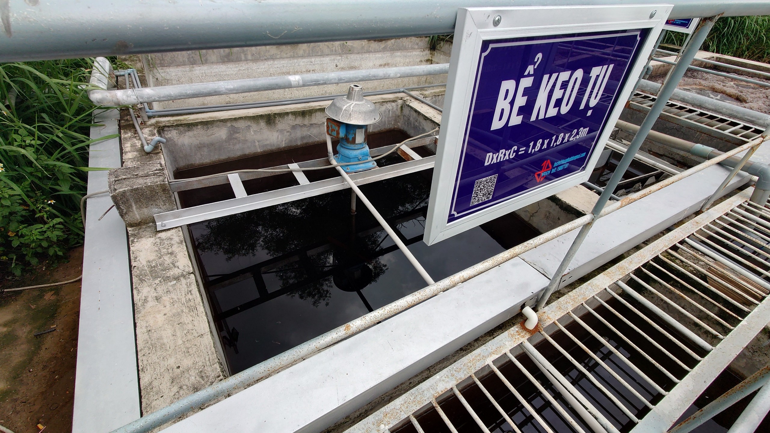 Nước thải được bơm chìm bơm từ bể trung gian qua bể keo tụ. Tại đây, sẽ được bổ sung thêm hệ hóa chất keo tụ PAC, Polymer. PAC là tác nhân có khả năng làm gắn kết các chất bẩn ở dạng hòa tan thành bông cặn, dưới tác dụng của Polymer các bông cặn li ti sẽ kết lại thành các bông có kích thước lớn hơn. Sau khi qua quá trình keo tụ - tạo bông, nước thải sẽ giảm được độ màu, khử mùi hôi, xử lý một phần COD và BOD.
