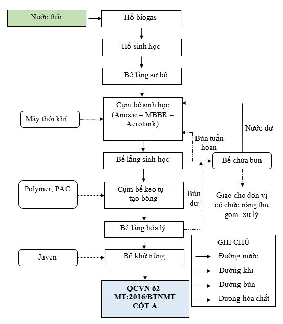 Nước thải phát sinh toàn dự án theo hệ thống thu gom về hầm Biogas. Tại đây, nước thải được lưu lại với thời gian khoảng 30-45 ngày để phân hủy kỵ khí. Nước thải sau khi qua hầm Biogas thì được đưa qua hồ sinh học 1 & 2 để tiếp tục đi vào hệ thống xử lý.