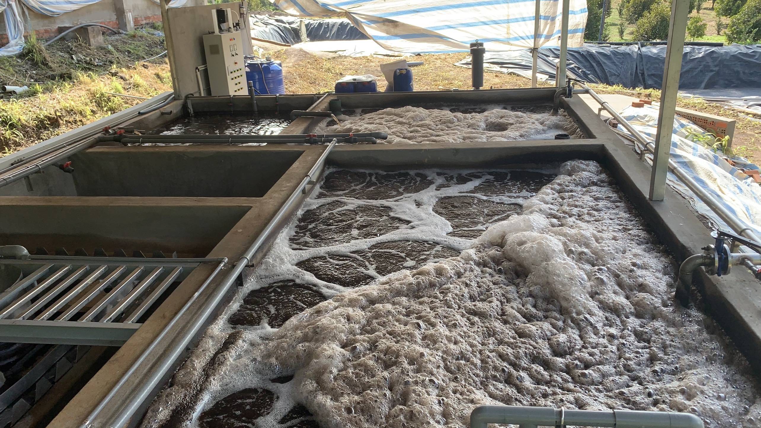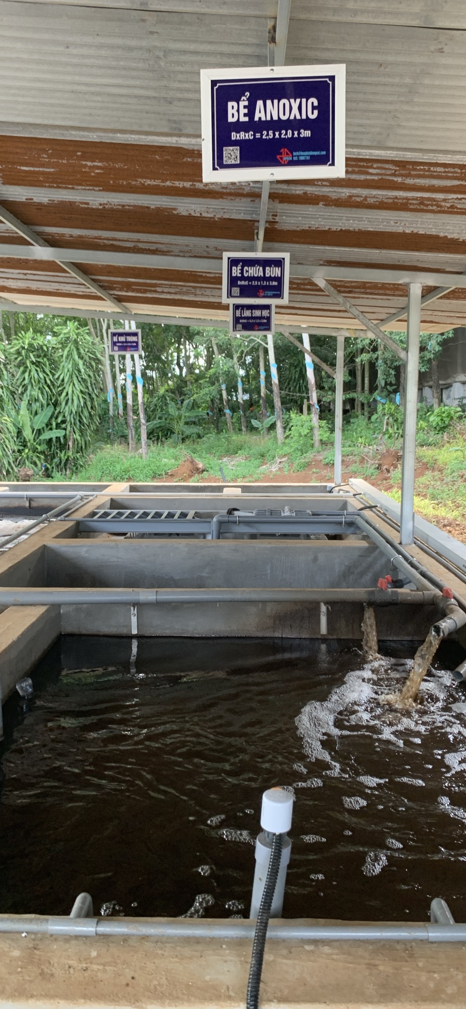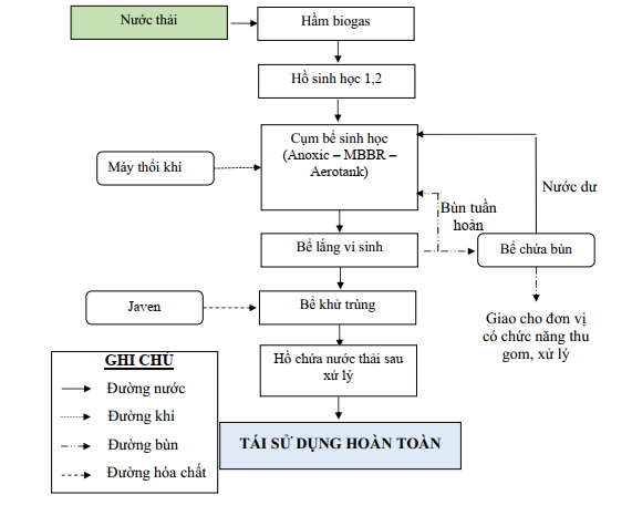 Nước thải phát sinh toàn dự án theo hệ thống thu gom về hầm Biogas. Tại đây, nước thải được lưu lại với thời gian khoảng 30-45 ngày để phân hủy kỵ khí. Nước thải sau khi qua hầm Biogas thì được đưa qua hồ sinh học 1 & 2 để tiếp tục đi vào hệ thống xử lý.