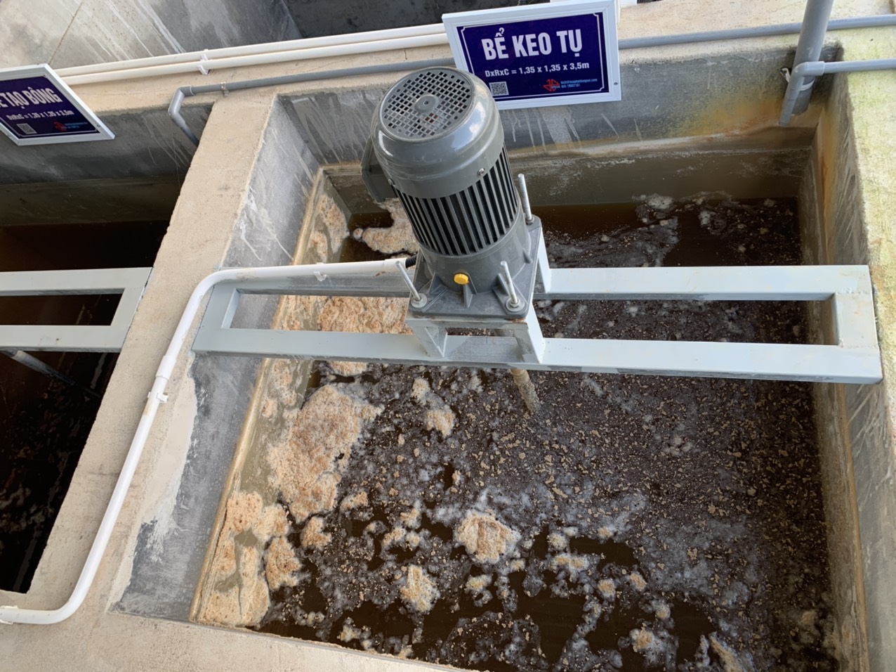 Nước thải được bơm chìm bơm từ bể trung gian qua bể keo tụ. Tại đây, sẽ được bổ sung thêm hệ hóa chất keo tụ PAC, Polymer. PAC là tác nhân có khả năng làm gắn kết các chất bẩn ở dạng hòa tan thành bông cặn, dưới tác dụng của Polymer các bông cặn li ti sẽ kết lại thành các bông có kích thước lớn hơn. Sau khi qua quá trình keo tụ - tạo bông, nước thải sẽ giảm được độ màu, khử mùi hôi, xử lý một phần COD và BOD.