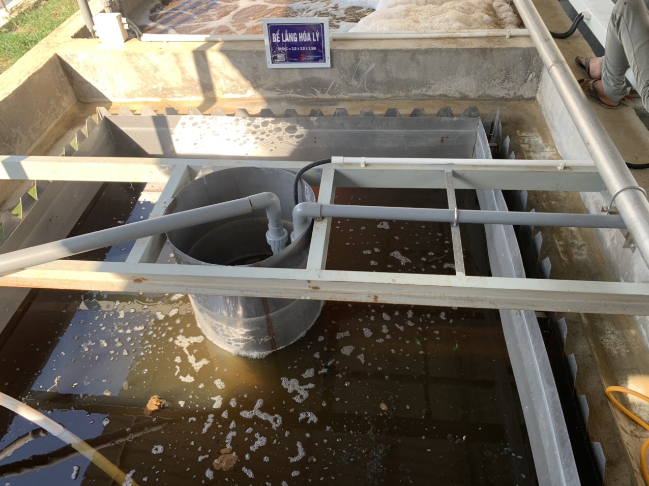 Tại đây, các bông cặn hóa lý tạo ra từ quá trình keo tụ - tạo bông được lắng xuống. Phần nước trong thu được sẽ tự chảy qua bể khử trùng. Lượng bùn sinh ra được bơm về bể chứa bùn để đem đi xử lý.