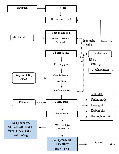 Nước thải phát sinh toàn dự án theo hệ thống thu gom về hầm Biogas. Tại đây, nước thải được lưu lại với thời gian khoảng 30-45 ngày để phân hủy kỵ khí. Nước thải sau khi qua hầm Biogas thì được đưa qua hồ sinh học 1 & 2 để tiếp tục đi vào hệ thống xử lý.