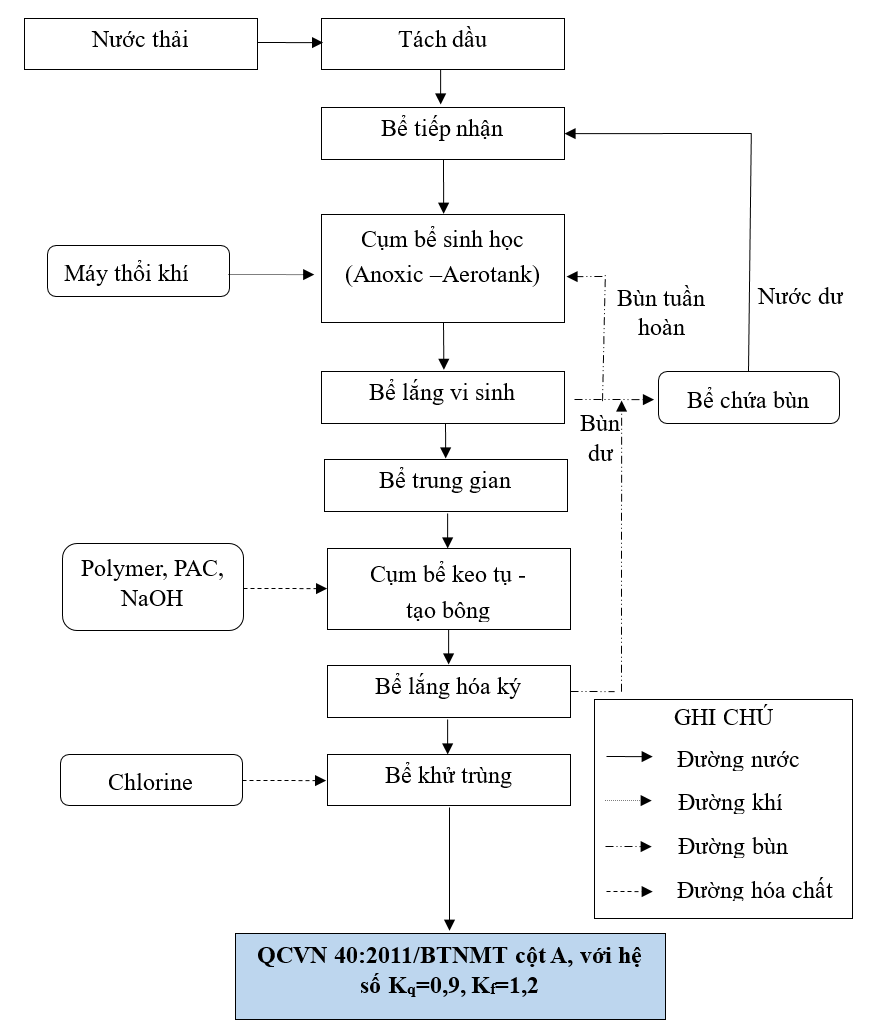 Nước sau khi qua bồn lọc áp lực đạt tiêu chuẩn QCVN 40:2011/BTNMT cột A, với hệ số Kq=0,9, Kf=1,2 được tái sử dụng cho sản xuất.