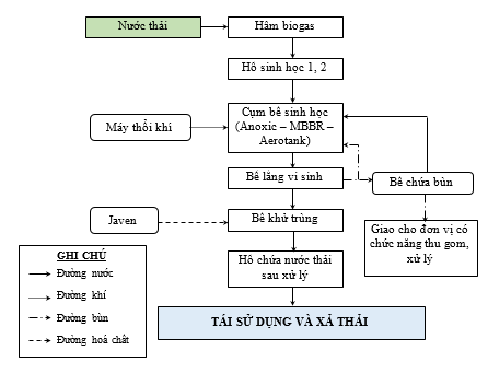 Nước thải phát sinh toàn dự án theo hệ thống thu gom về hầm Biogas. Tại đây, nước thải được lưu lại với thời gian khoảng 30-45 ngày để phân hủy kỵ khí. Nước thải sau khi qua hầm Biogas thì được đưa qua hồ sinh học 1 & 2 để tiếp tục đi vào hệ thống xử lý.