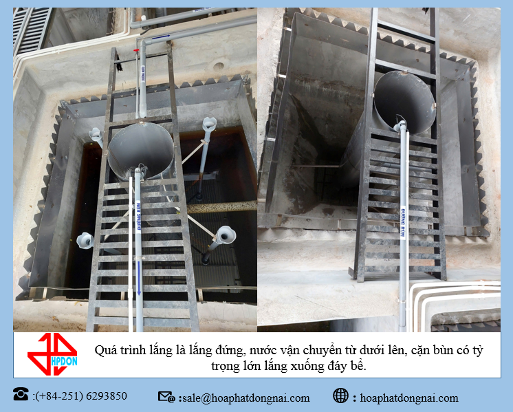 Nước thải sau khi ra khỏi bể vi sinh hiếu khí tự chảy vào ống trung tâm của bể lắng với vận tốc 28-30mm/s nhằm phân phối đều nước thải trong vùng lắng của bể lắng, nước thải ra khỏi ống trung tâm của bể lắng với vận tốc 0.5 - 0.8mm/s.