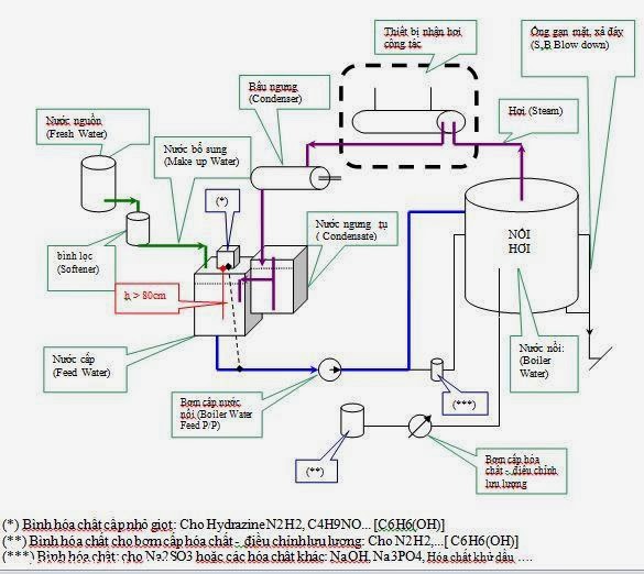 - Hòa với nước cấp vào bình chứa – cho chảy nhỏ giọt liên tục vào két Nước cấp (Feed Water) (xem II). Ống bổ sung phải cắm gần miệng hút của bơm, sâu dưới mặt nước hơn 80cm (tránh tác dụng trực tiếp với O2 trong không khí) hoặc nối trực tiếp vào đường hút của bơm.
